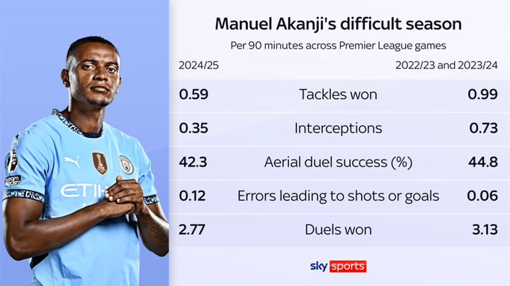 Their injuries have forced Manuel Akanji to start 25 games already, straight off the back of playing every minute of Switzerland's quarter-final run at Euro 2024 last summer and the vast majority of City's games last term. He has looked unfit himself and his defensive metrics have faded almost unanimously.