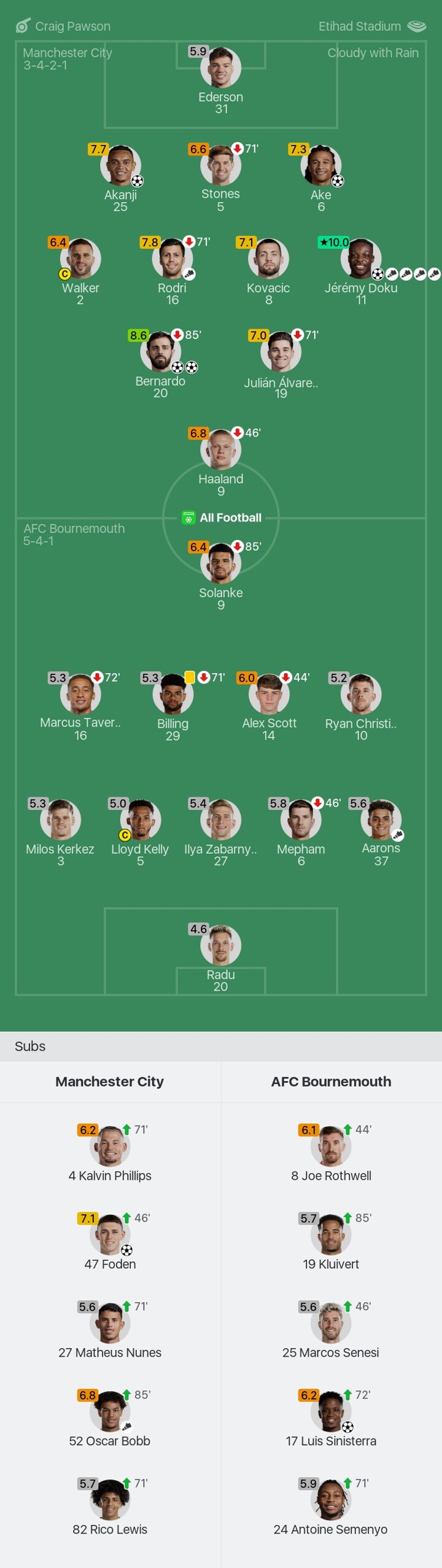 We bring you the player ratings for Manchester City vs AFC Bournemouth as Jérémy Doku becomes Man of the Match with a rating of 10.0.