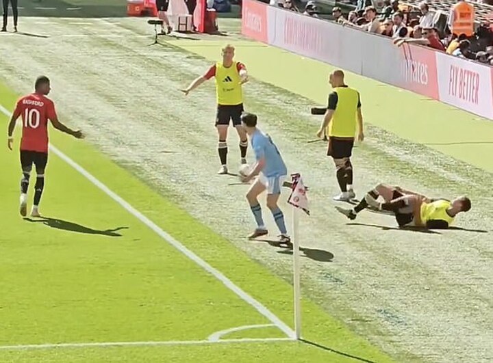 In the video, Silva can be seen running to the touchline to collect a ball that had gone out of play. As he collects it, he turns his back into Evans who is warming up and sends him flying.