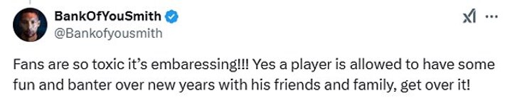 'Fans are so toxic its embarrassing! Yes a player allowed to have some fun and banter over new years with his friends and his family, get over it.'