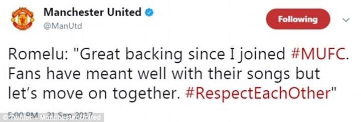 ‘Great backing since I joined United,’ the striker said at the time. ‘Fans have meant well with their songs but let’s move on together. #respecteachother.’