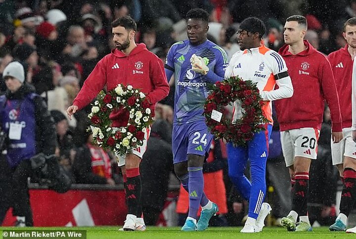 Wreaths were brought onto the pitch before the match by United captain Bruno Fernandes and Forest star Anthony Elanga, who spent seven years at Old Trafford before joining Forest last year.