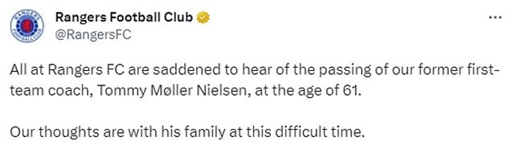 Rangers led the tributes to the Dane on social media, posting: 'All at Rangers FC are saddened to hear of the passing of our former first team coach, Tommy Moller Nielsen, at the age of 61. Our thoughts are with his family at this difficult time.'