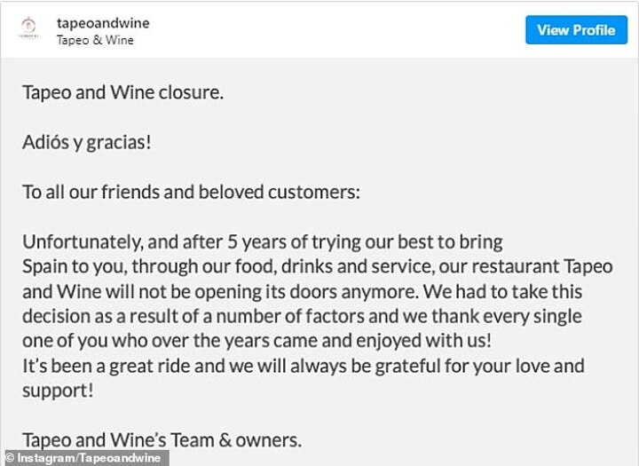 'Unfortunately, and after five years of trying our best to bring Spain to you, through our food, drinks and service, our restaurant Tapeo and Wine will not be opening its doors anymore.