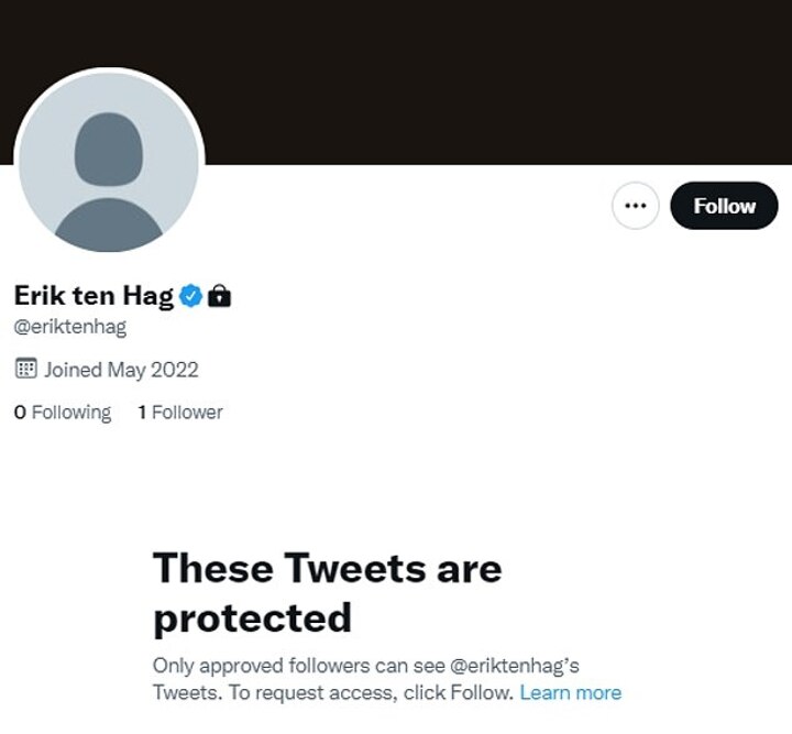 Manchester United's incoming manager Erik ten Hag has finally joined Twitter, but his account is currently locked and is not displaying any information.