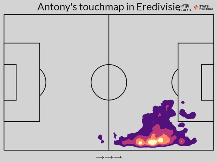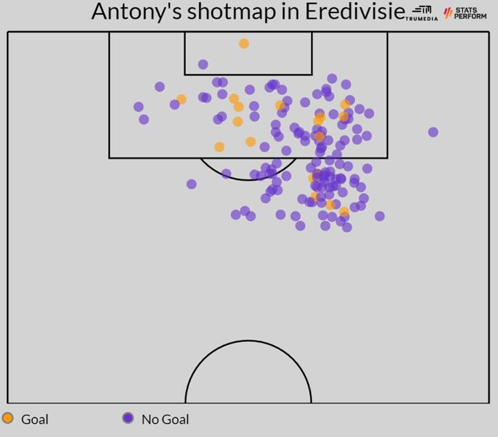 Despite only playing in 23 games, Antony showed a propensity to shoot a lot. His 79 efforts rank second in the Ajax team last season, with other players managing at least eight more games than him, while his 34.2% accuracy on target (27 shots) ranks 12th.