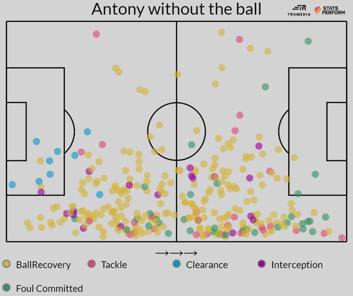 Antony had some impressive stats among his Ajax peers last season, playing 23 of the club's 34 league games on the way to winning the league. While he did not play as many games due to an ankle injury, he was still one of the club's top offensive leaders.