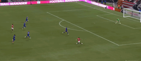 56' The ball collides with Garner's arm in the box but the ref says no penalty