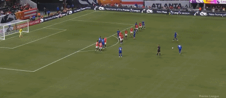 27' Mbeumo curls an on-target free kick over the wall but Pickford palms it away