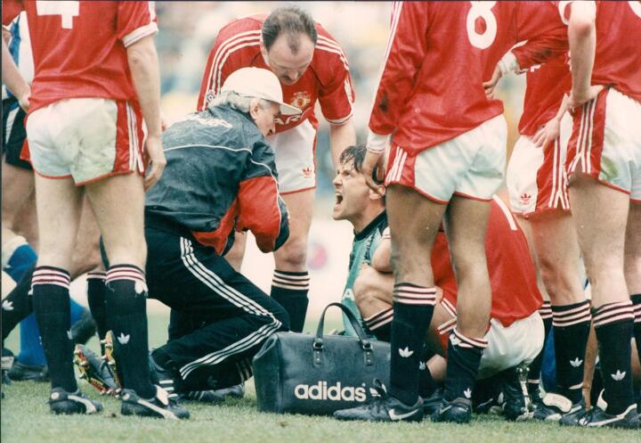 The animated shot-stopper got into a furious row on the pitch with the United physio, as skipper Bryan Robson tried to calm him down, while blood poured from the joint.