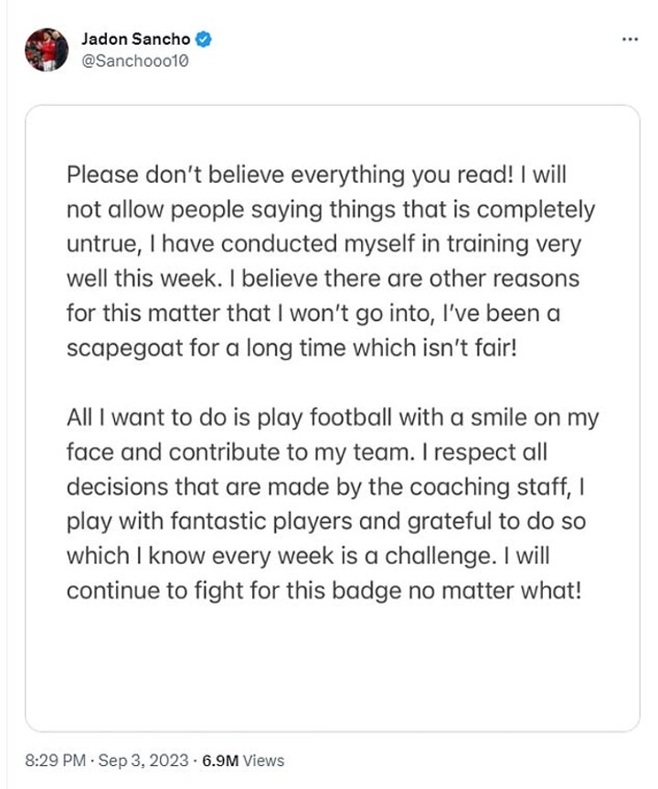 Ten Hag has already faced challenges with one player after he dropped Sancho for their 3-1 loss to Arsenal before the international break. The player has now been ordered to stay away from first team training over his social media post in response to being axed for the game.