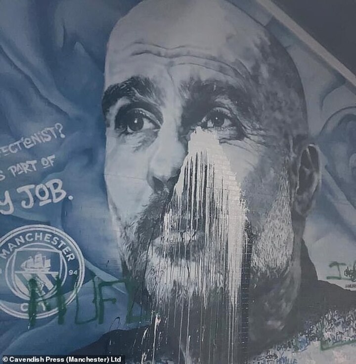 A mural of Pep Guardiola close to Manchester City's Etihad Stadium has been defaced with 'MUFC' graffiti just hours after it was unveiled.