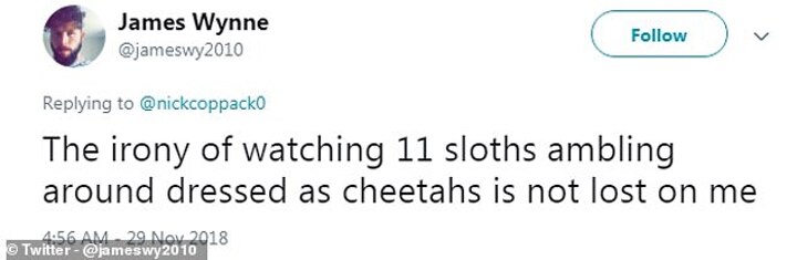 While another Tweet read: 'The irony of watching 11 sloths ambling around dressed as cheetahs is not lost on me.'