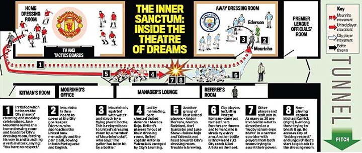 That led to a bottle being thrown at Mourinho before a brawl broke out in the corridor as United players came to the aid of their manager.