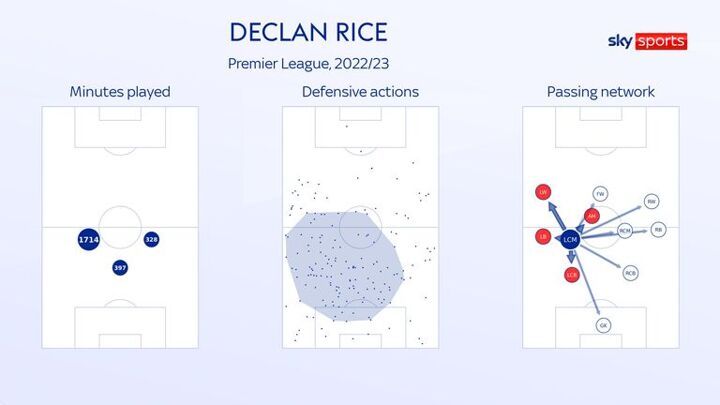 In terms of evolution, the graphic below highlights how Rice has evolved over the past six seasons, breaking into the first team as a right-sided centre-back in 2017/18 before adopting a defensive midfielder role.