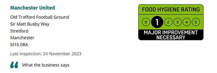 A spokesperson for Trafford Council said: 'We can confirm that the hygiene rating for Old Trafford (Manchester United) has been downgraded from five to one.
