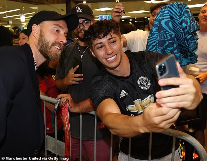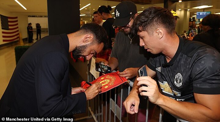 Fernandes, Antony and Christian Eriksen all stopped to greet fans and pose for photos with them as they made their way through the airport.