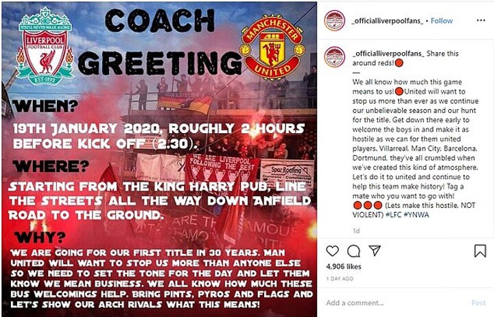 A fans group - Official Liverpool fans - has called upon home supporters to 'bring pints, pyros and flags' for when Ole Gunnar Solskjaer's squad arrive on their team bus at Anfield.