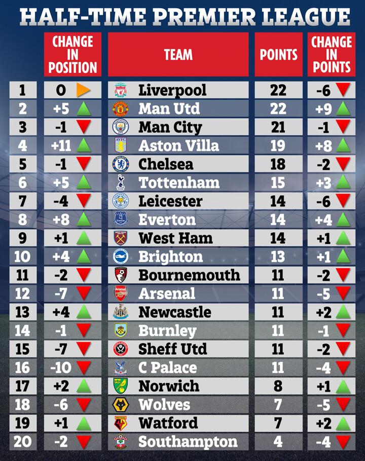 Finally, it is Crystal Palace that drop the furthest in the first-half Premier League table, falling from sixth to 16th.