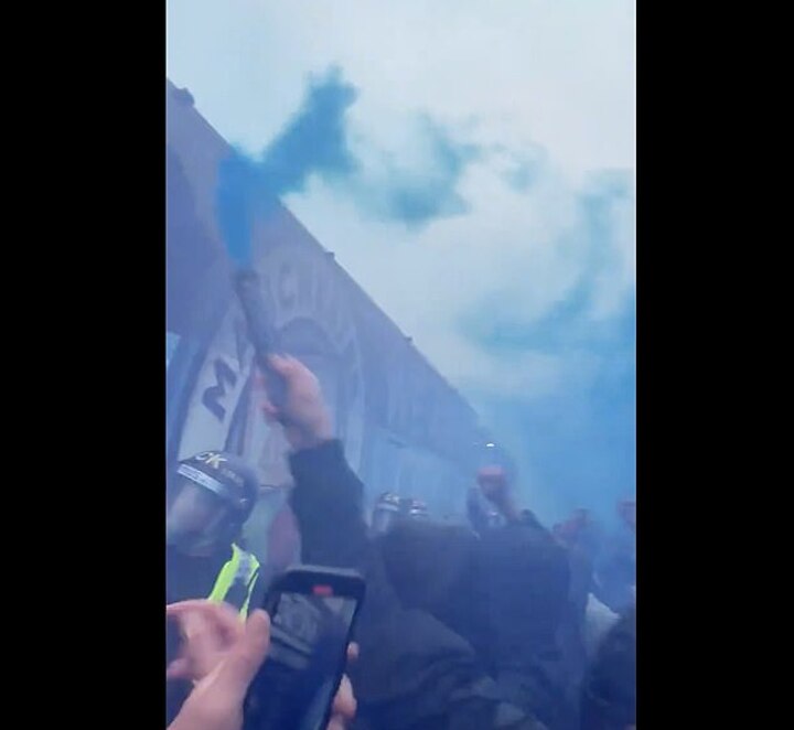 Police wearing riot gear were seen walking alongside the bus as they encouraged fans to keep their distance.