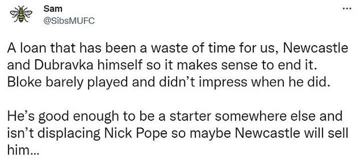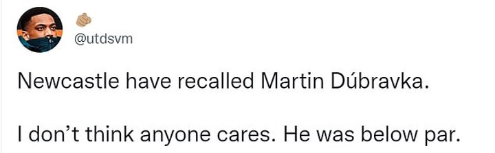 They wrote: 'Newcastle have recalled Martin Dúbravka. I don’t think anyone cares. He was below par.'