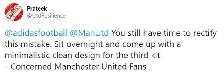 Some supporters even encouraged Adidas to re-think their decision, with one writing: ' You still have time to rectify this mistake. Sit overnight and come up with a minimalistic clean design for the third kit - Concerned Manchester United Fans.'