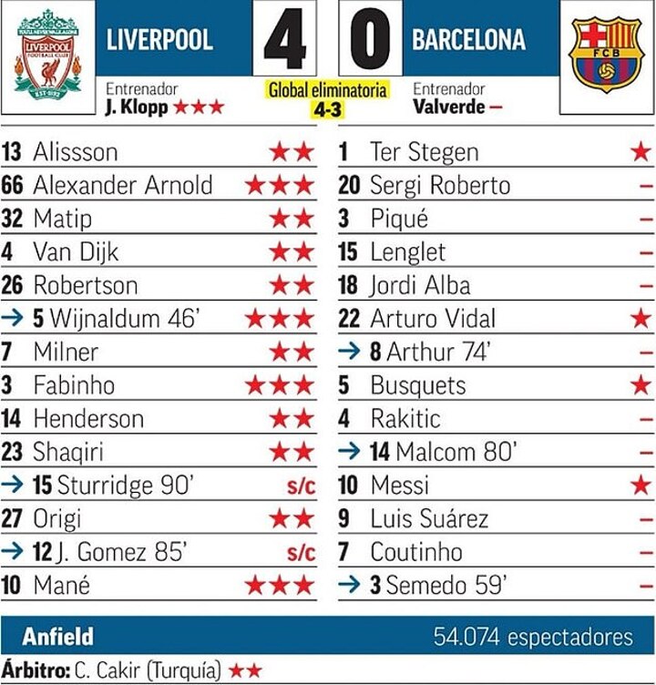 Reds manager Jurgen Klopp also gets three stars, while Barca boss Ernesto Valverde, like Pique, Coutinho and Suarez, gets a flat zero.