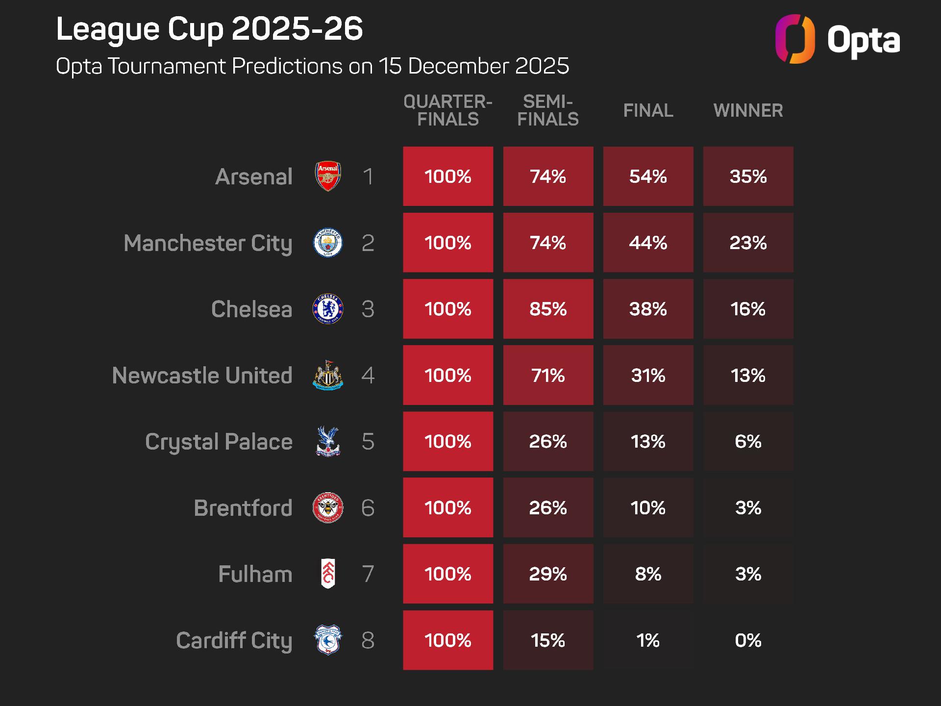 They are among the favourites to lift the trophy this year, with the Opta supercomputer giving them a 16% chance of winning the competition, with Arsenal (35%) and Manchester City (23%) the only teams with a higher likelihood.