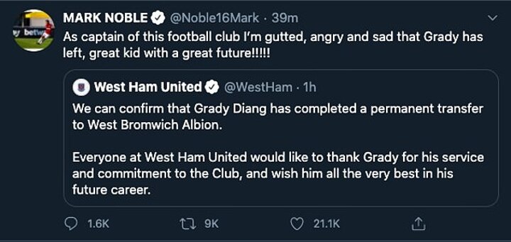 West Ham captain Mark Noble has tweeted about his anger over the club's sale of winger Grady Diangana to Premier League rivals West Brom.