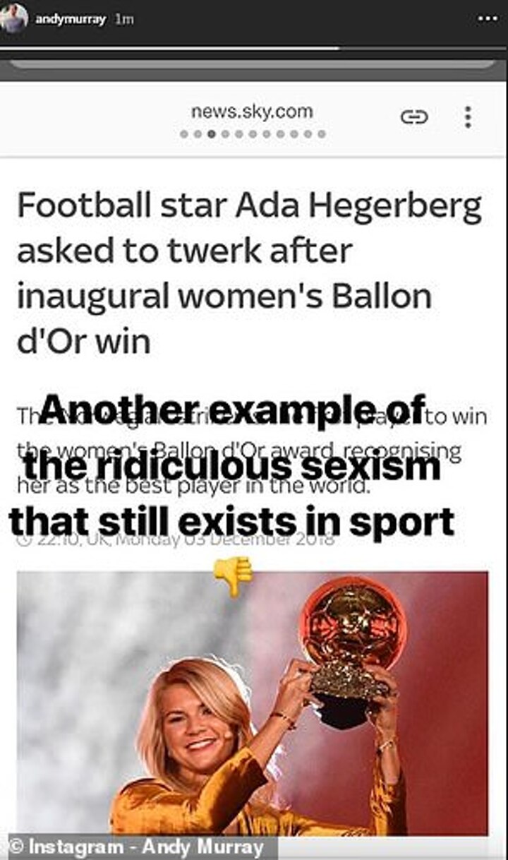 Tennis star Andy Murray spoke out against the 'twerk' comments on his Instagram story describing it as 'another example of the ridiculous sexism that still exists in sport'.