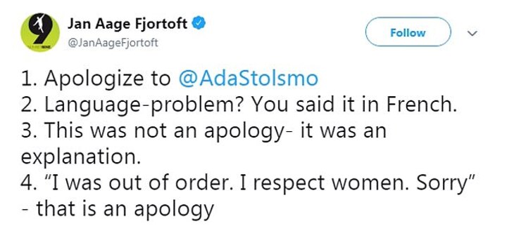 Meanwhile, former Swindon player Jan Aage Fjortoft listen how Solveig could respond properly. '1. Apologize to @AdaStolsmo 2. Language-problem? You said it in French. 3. This was not an apology- it was an explanation. 4. “I was out of order. I respect women. Sorry” - that is an apology'.