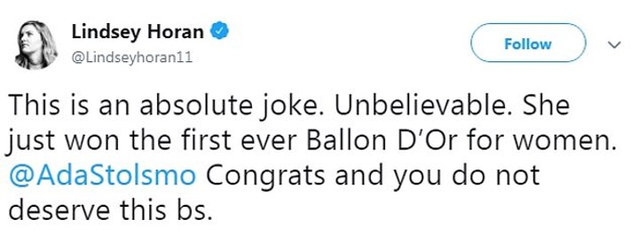 United States national team player Lindsey Horan wrote: 'This is an absolute joke. Unbelievable. She just won the first ever Ballon D’Or for women. @AdaStolsmo congrats and you do not deserve this bs.'