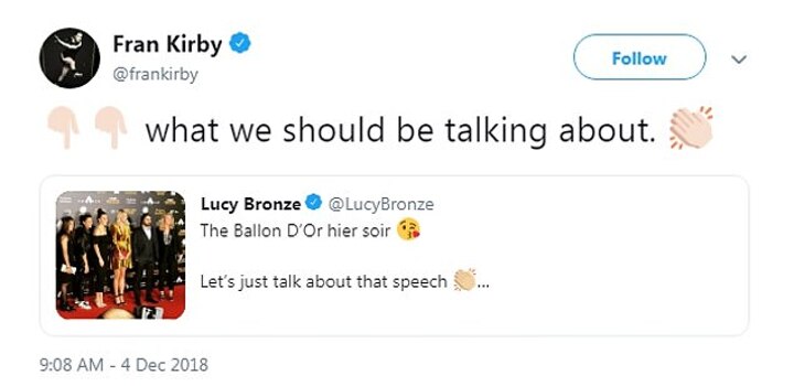 Chelsea's Fran Kirby also highlighted the speech and wrote: 'what we should be talking about'.