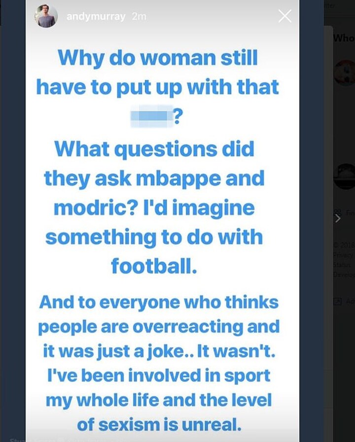 An unimpressed Murray wrote: 'Why do women still have to put up with that s***? What questions did they ask Mbappe and Modric.