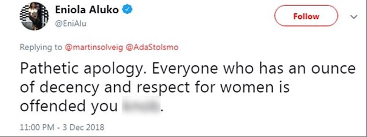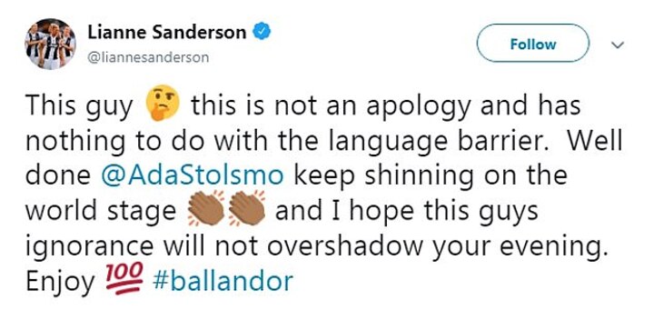'Well done @AdaStolsmo keep shinning (sic) on the world stage... and I hope this guys ignorance will not overshadow your evening. Enjoy.'