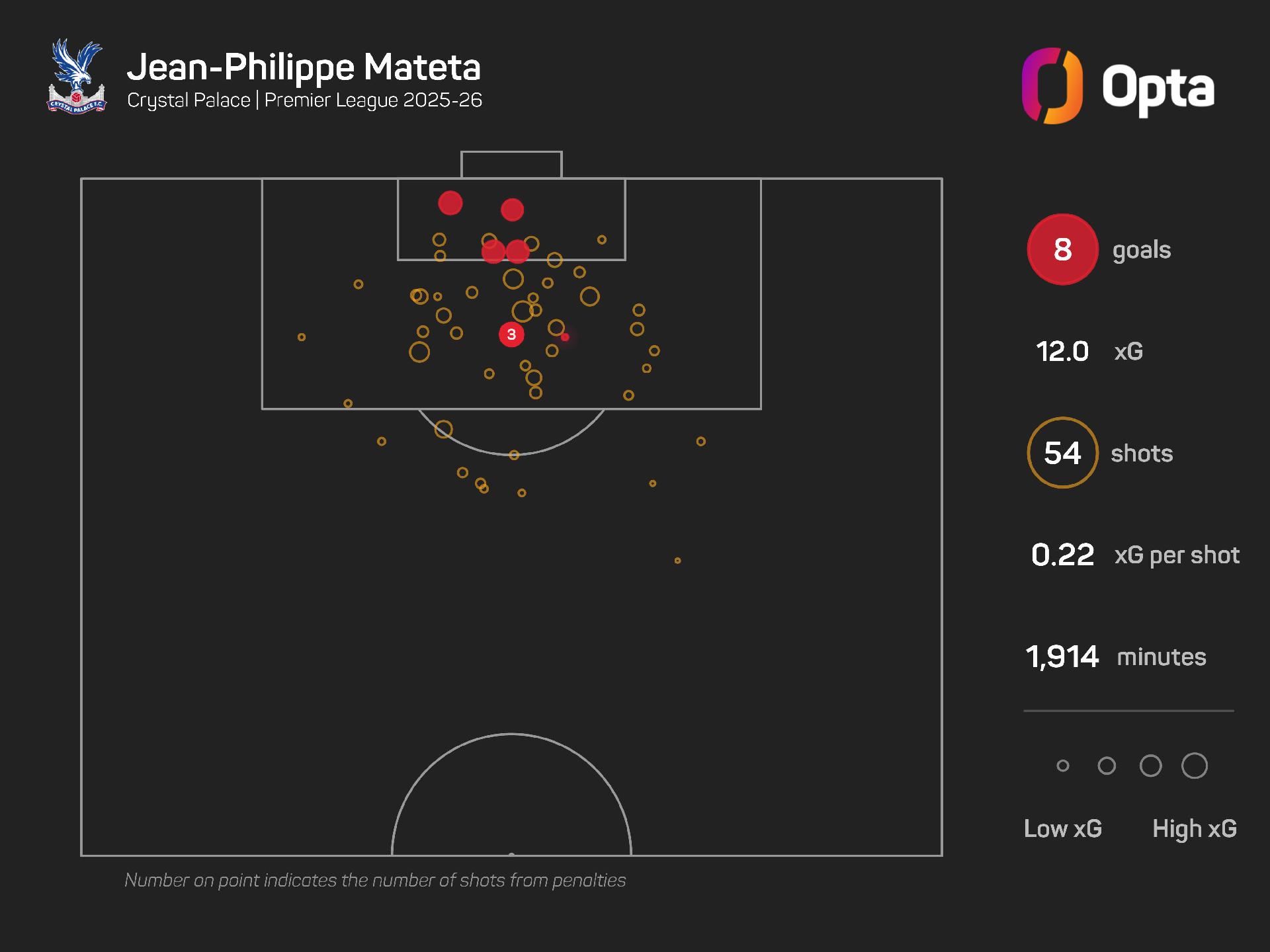 He also ranks second in their squad, behind Mateta in both instances, for shots (34) and touches in the opposition box (66).