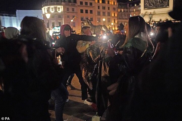 Pictures showed rival groups of demonstrators clashing in Trafalgar Square, with one counter-protester seen wielding a stick - as Michael Gove was hassled by pro-Palestinians shouting 'shame on you' as he tried to leave Victoria station.