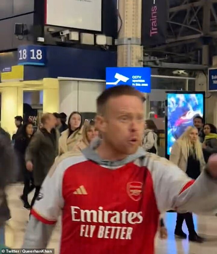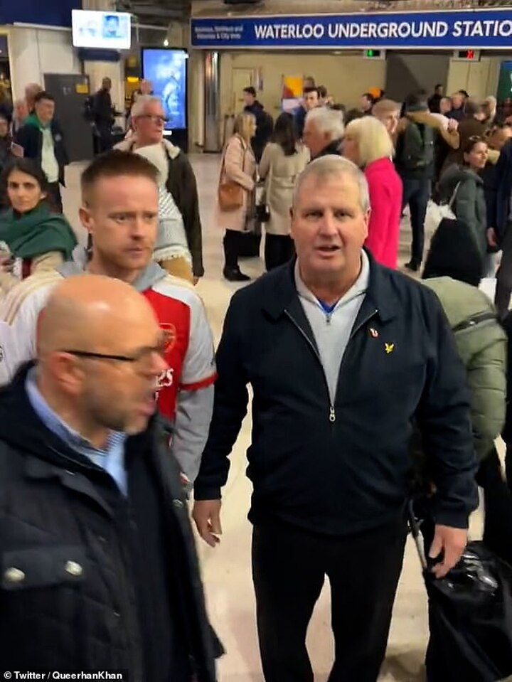 Four men, including one in an Arsenal shirt, can be seen walking through the station before shouting vile expletives at protestors in the station.