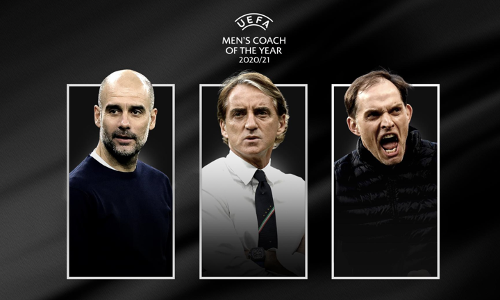 Josep Guardiola, Roberto Mancini and Thomas Tuchel are on the shortlist for the 2020/21 UEFA Men's Coach of the Year award.