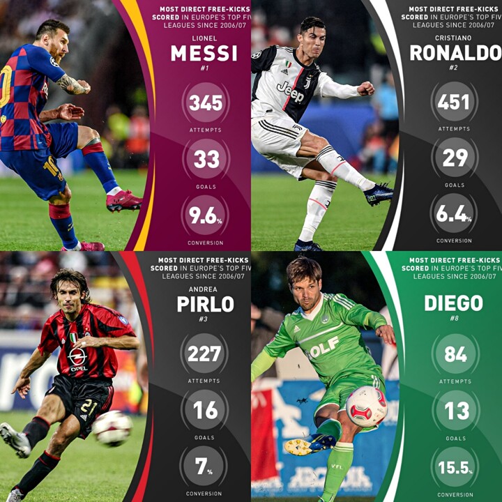 Lionel Messi has scored more free-kicks than any other player in Europe's top five leagues since 2006/07, but Andrea Pirlo left in 2015 and he's still third. Also, Diego is a wizard.