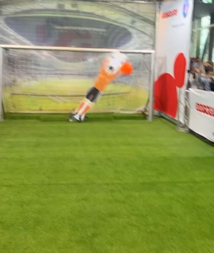 He attempted to place the ball into the top right corner, but his shot was no match for the lightning reflexes of robo-goalie.