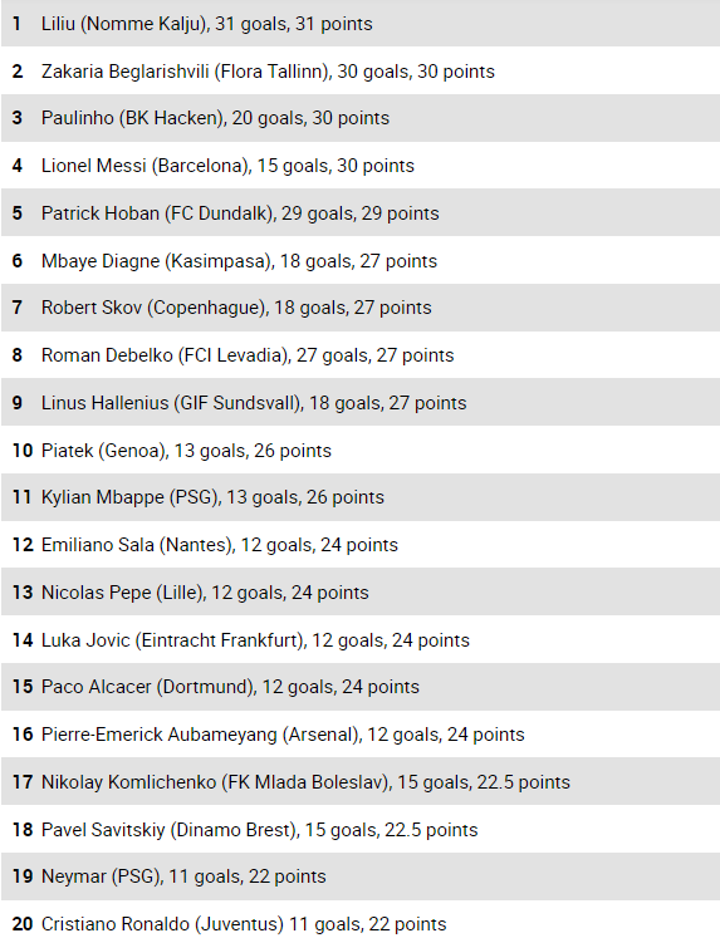 Goals scored in the Estonian league, where Nomme Kalju striker Liliu plays, are only worth one point, which is why he is just a point ahead of Messi despite having scored 31 times so far.