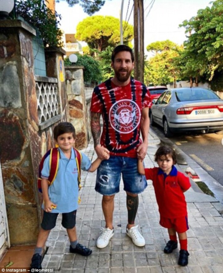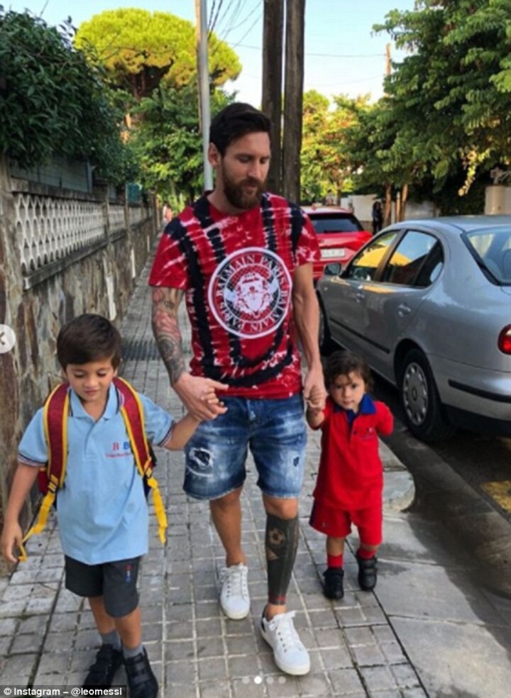 The Barcelona star isn't on international duty, and, subsequently, was able to take his two eldest sons, Thiago and Mateo, to school.
