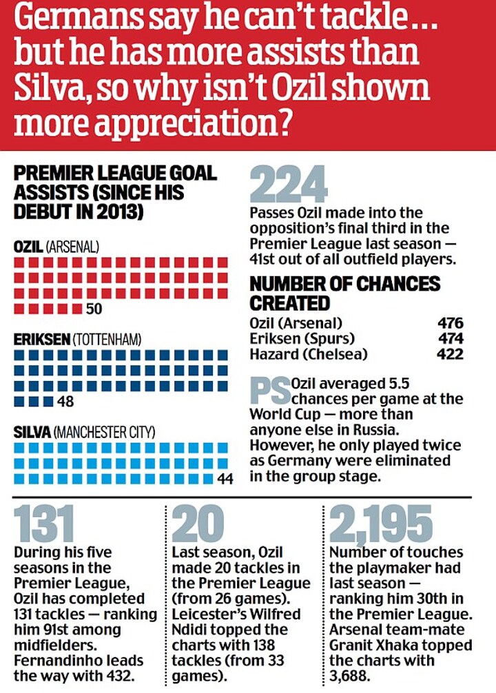 It is only a few weeks since Ozil missed the end of the last Premier League campaign with a back injury after he was criticised for his performance in the Europa League semi-final against Atletico Madrid. Even away from the complexities of German politics and religion, he divides opinion.