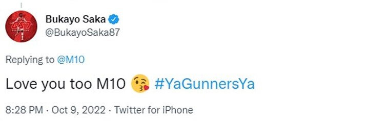 Saka then replied: 'Love you too M10 #YaGunnersYa,' followed by a kiss emoji.