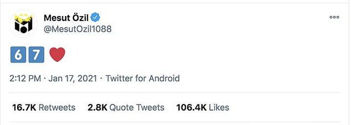 The World Cup winner shared another tweet on Sunday afternoon that hinted towards life in Turkey, tweeting the number 67 along with a love heart emoji.