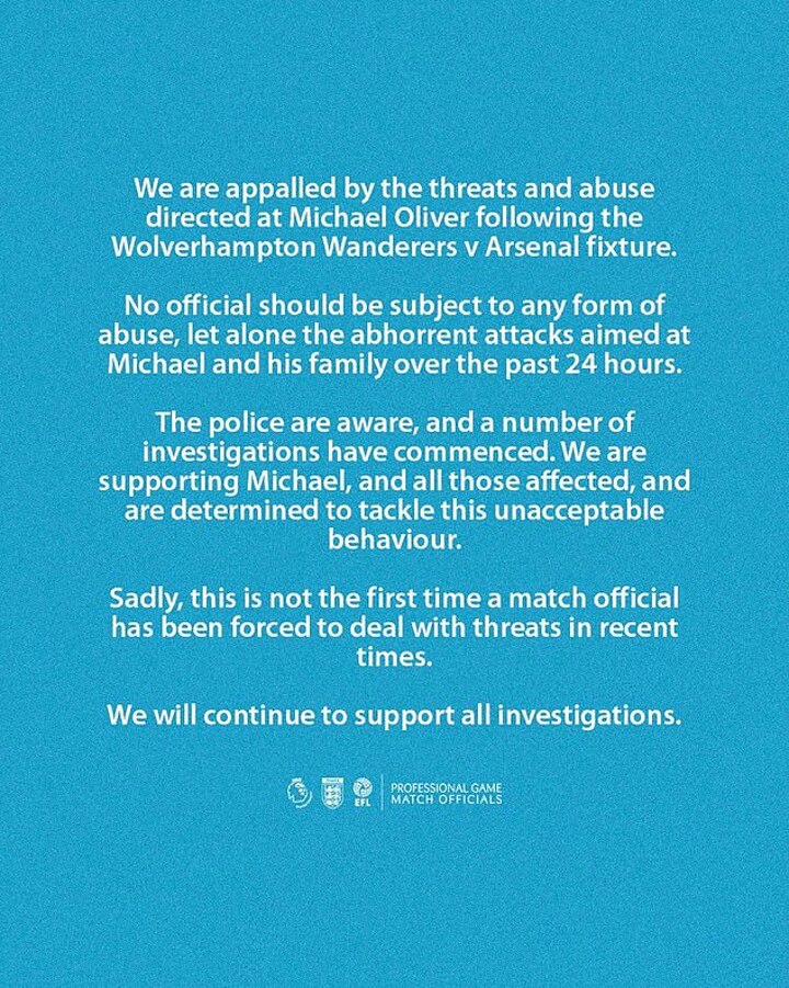 A statement from PGMOL on Sunday read: 'We are appalled by the threats and abuse directed at Michael Oliver following the Wolverhampton Wanderers v Arsenal fixture.