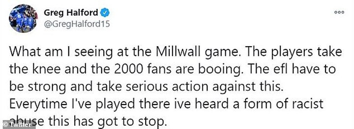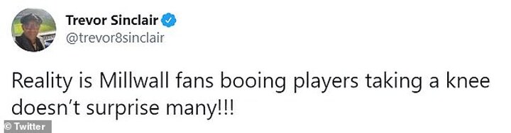 He wrote: 'Reality is Millwall fans booing players taking a knee doesn't surprise many!!!'