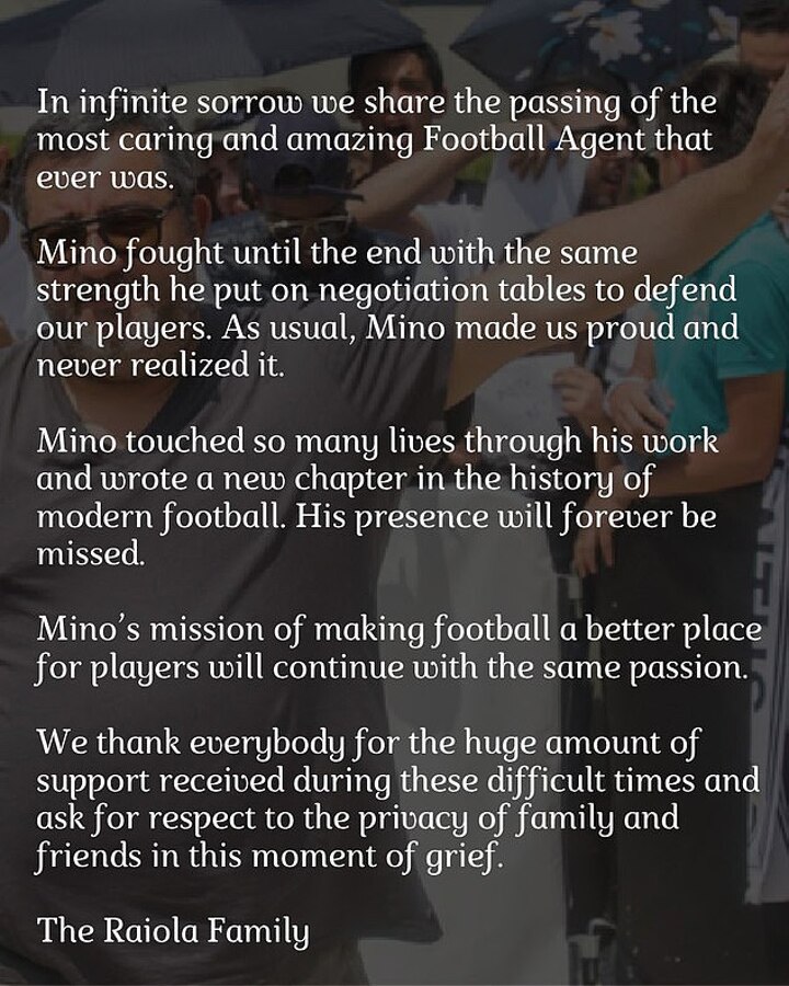 Raiola's family penned a touching statement to confirm his shocking passing at the weekend.