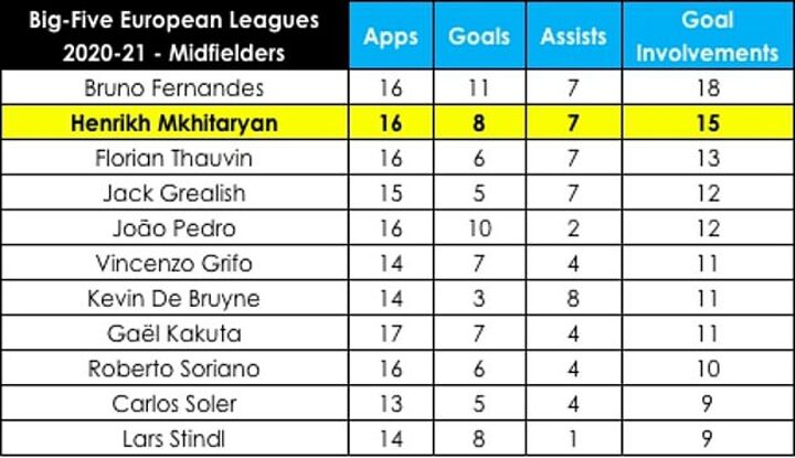 Manchester United playmaker Bruno Fernandes leads the way with 18 goal involvements this season, but Mkhitaryan isn't far behind with 15. Most pundits would rate Manchester City's Kevin De Bruyne as the best creative outlet in world football, but the Belgian is lagging behind the Roma man with 11 involvements.